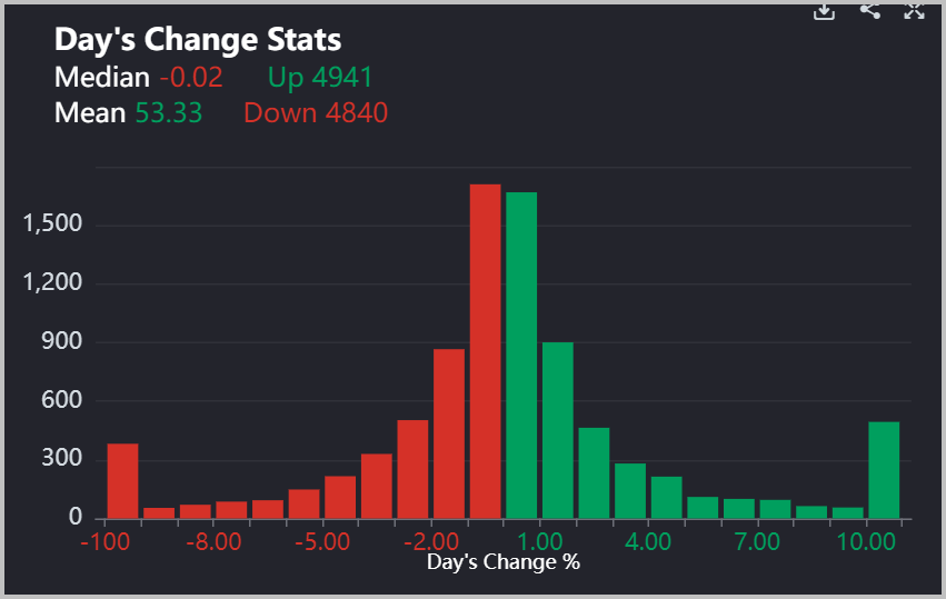 We have a 19.5% bearish setup skew for Friday’s trading. The bullish to bearish breakout favors bearish breakouts by 81%. The equal-weight market measure by RSP was down only -0.17% while the SPY was down -0.32%. And there were actually more advancers (4941) than decliners (4840) today.