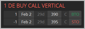 I’m considering a bull call debit spread in Deere (DE) similar to the structure below; I’d pay no more than $2.50 per spread and set a target profit of $4.85 when filled on the entry.