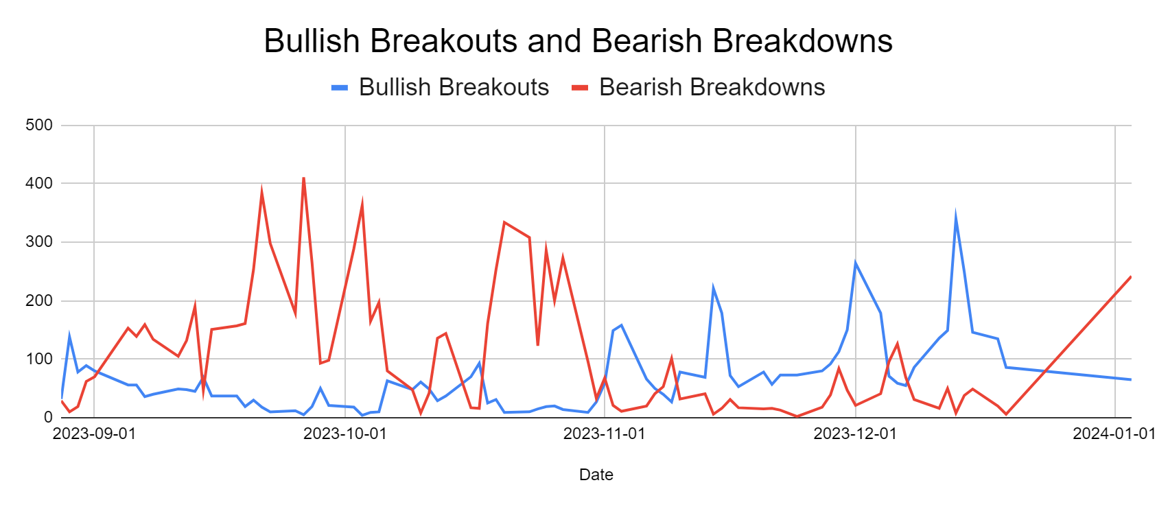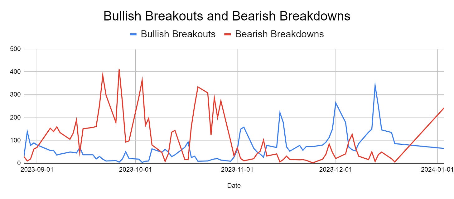 The chart below shows the bearish breakout skew (but note it’s more dramatic simply from having skipped 10 days at the end of DEC).