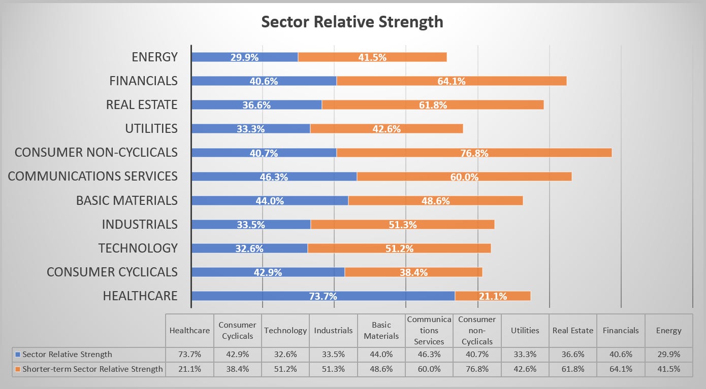 Consumer Non-cyclicals (XLP) Financials (XLF), and Communications Services (XLC) have the relative strength momentum right now.