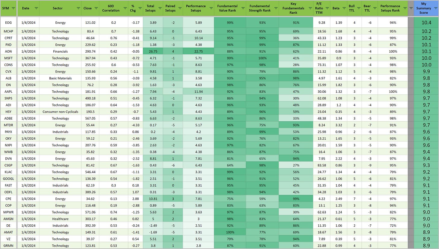 Use the Spreadsheet: Click the link above (orange text)! If you’re reading this email, 80% of any value you can extract from it is stored in the spreadsheet where I update six tabs of stock analysis daily (the rest of the stuff here is just me blathering on about who knows what…) So, click the link and work the spreadsheet to create your own watchlists. You can create your own single-metric analysis score by ranking four metrics from 0 to 5. It’s a great shortcut for finding setups you’re interested in.