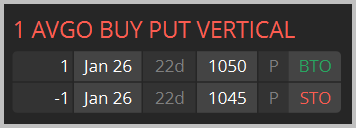 I’m considering a bear put debit spread in Broadcom (AVGO) similar to the structure below; I’d pay no more than $2.50 per spread and set a target profit of $4.85 when filled on the entry.