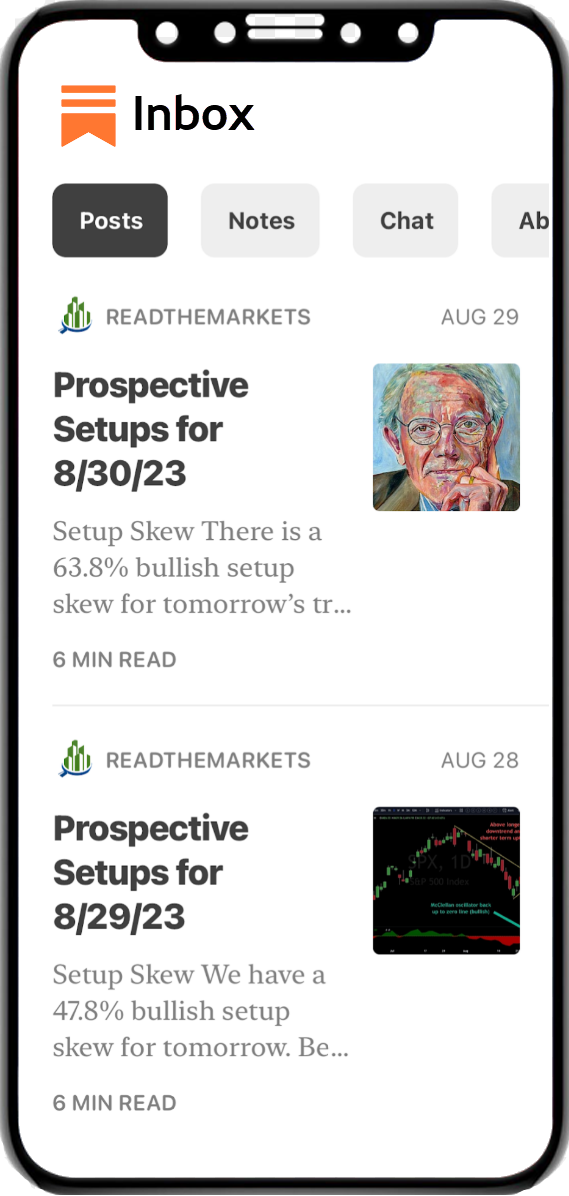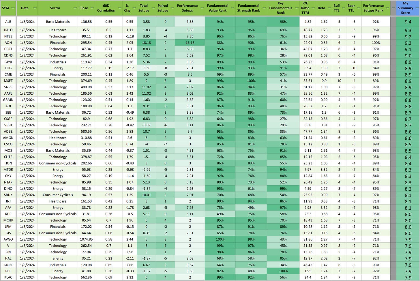 Use the Spreadsheet: Click the link above (orange text)! If you’re reading this email, 80% of any value you can extract from it is stored in the spreadsheet where I update six tabs of stock analysis daily (the rest of the stuff here is just me blathering on about who knows what…) So, click the link and work the spreadsheet to create your own watchlists. You can create your own single-metric analysis score by ranking four metrics from 0 to 5. It’s a great shortcut for finding setups you’re interested in.