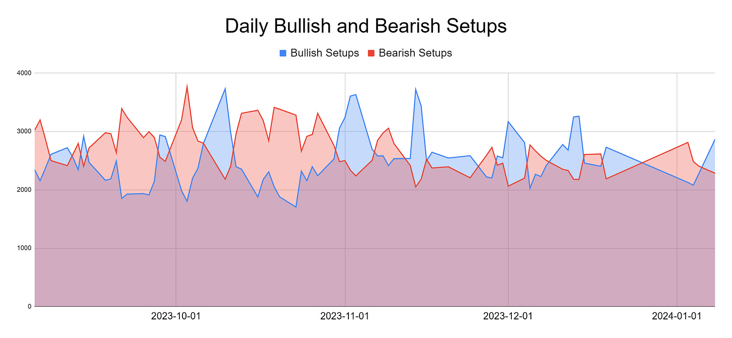 Paired Setups (Bull TTL & Bear TTL): The Paired Setups column is the net number of screens triggering on the current day registering either one or more bullish or bearish mean reversion setups. There are 24 bullish mean reversion setups (the “Bull TTL” column) and 24 bearish (the “Bear TTL column”). The sum of these columns is the Paired Setups column value.