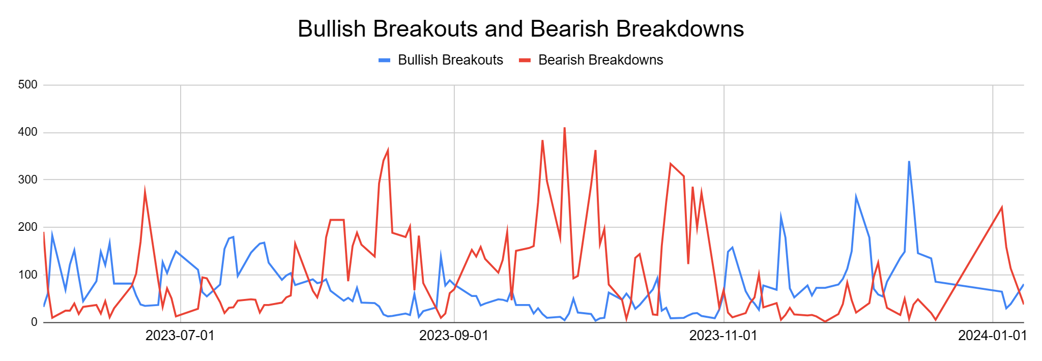 The number of bullish breakouts has now crossed up through the descending bearish breakdown line. And advancers broadly outpaced decliners (chart #2 below).