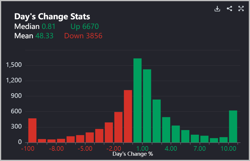 Today was a strong and broad bullish grind higher. Surprised me for sure. We have a 25.4% bullish setup bias for Tuesday’s trading (chart #1 below). Bullish breakouts (81) were more than 2x the number of bearish breakdowns (38) (chart #3 below).