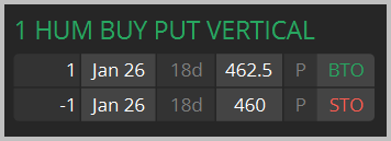 I’m considering a bear put debit spread on Humana (HUM) similar to the structure below; I’d pay no more than $1.25 per spread and set a target profit of $2.45 if filled on the entry. Note, this close to the same trade as yesterday. With earnings season, it is important but difficult to find stocks that will not be reporting earnings in the window needed to run the trade.